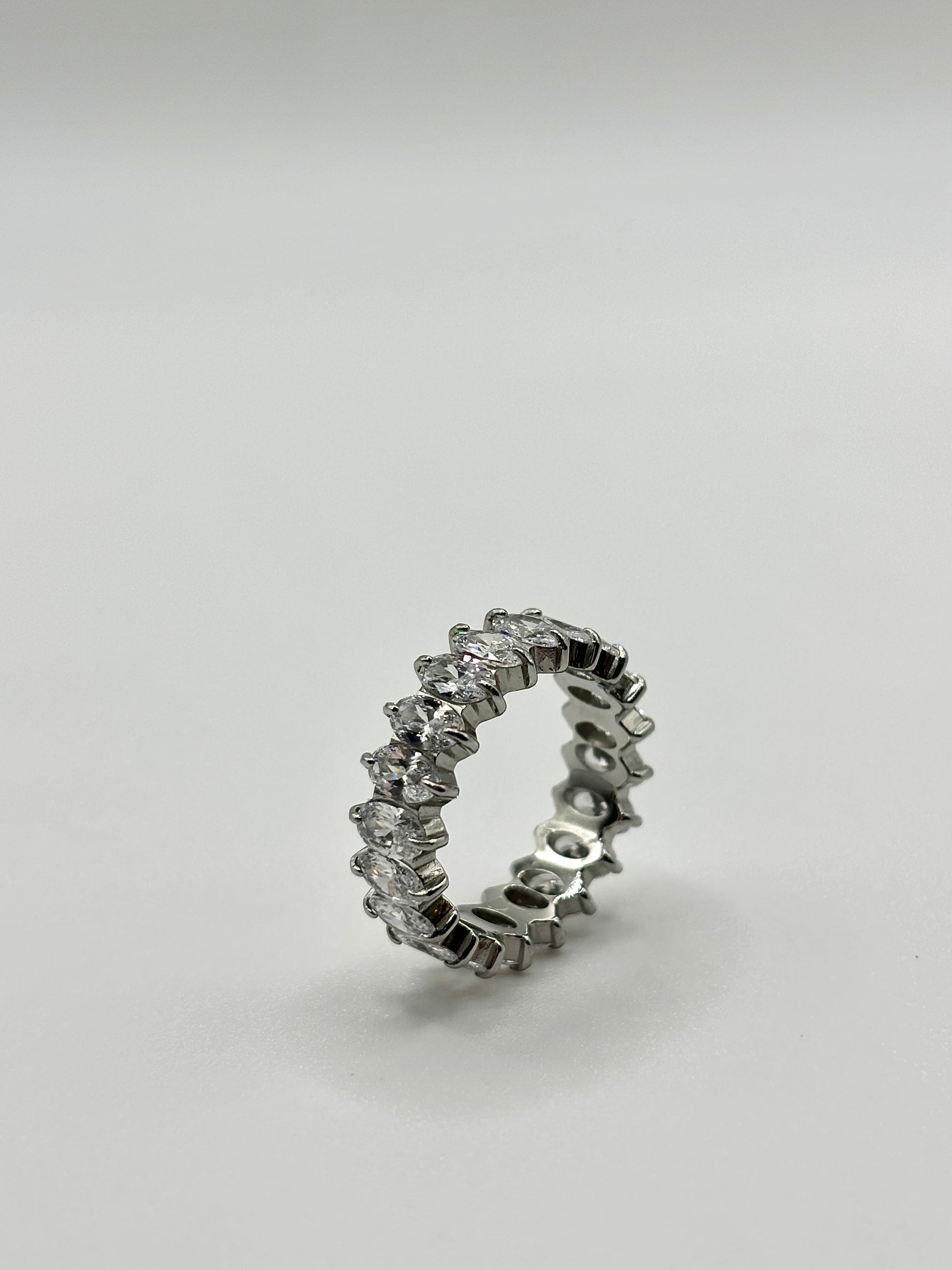 Material: Oțel inoxidabil 316L / oțel titanium de înaltă calitate, acoperit cu placaj de rhodiu, oferind un finisaj argintiu intens și durabil. Piatre cubic zirconia (CZ) cu tăietură ovală, selectate pentru claritate și strălucire maximă, dispuse complet pe circumferința inelului pentru un efect „eternity”.
